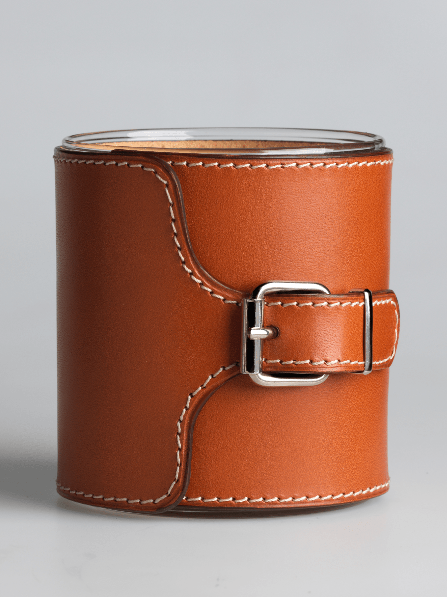 Nous avons dessiné ce modèle exclusif Jeudi et l'avons confié à un artisan maroquinier qui a travaillé à la main cette pièce unique. La finition piqué sellier, les bords lissés, la bougie au cœur de l'objet en font une pièce unique et rare. Le parfum Ambre d'Antioche s'harmonise à la couleur naturelle de la peau qui a fait l'objet d'un tannage végétal.